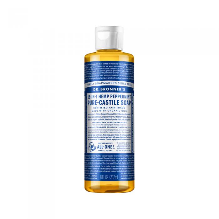 Dr. Bronner’s 18-in-1 Pure-Castile Soaps are good for just about any cleaning task. Face, body, hair – food, dishes, laundry, mopping, pets – clean your house and body with no synthetic preservatives, detergents or foaming agents – none!