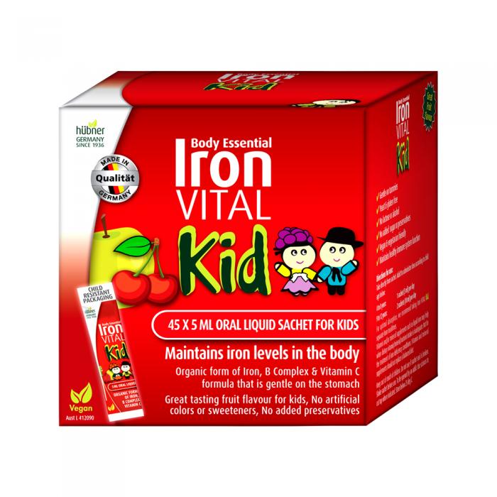 Body Essential Iron VITAL Kid is a bioavailable liquid supplement from Germany that is suitable for children and contains an organic form of liquid iron, with B group vitamins for vitality and vitamin C, and added herbal extracts and natural fruit concentrates for a great taste.